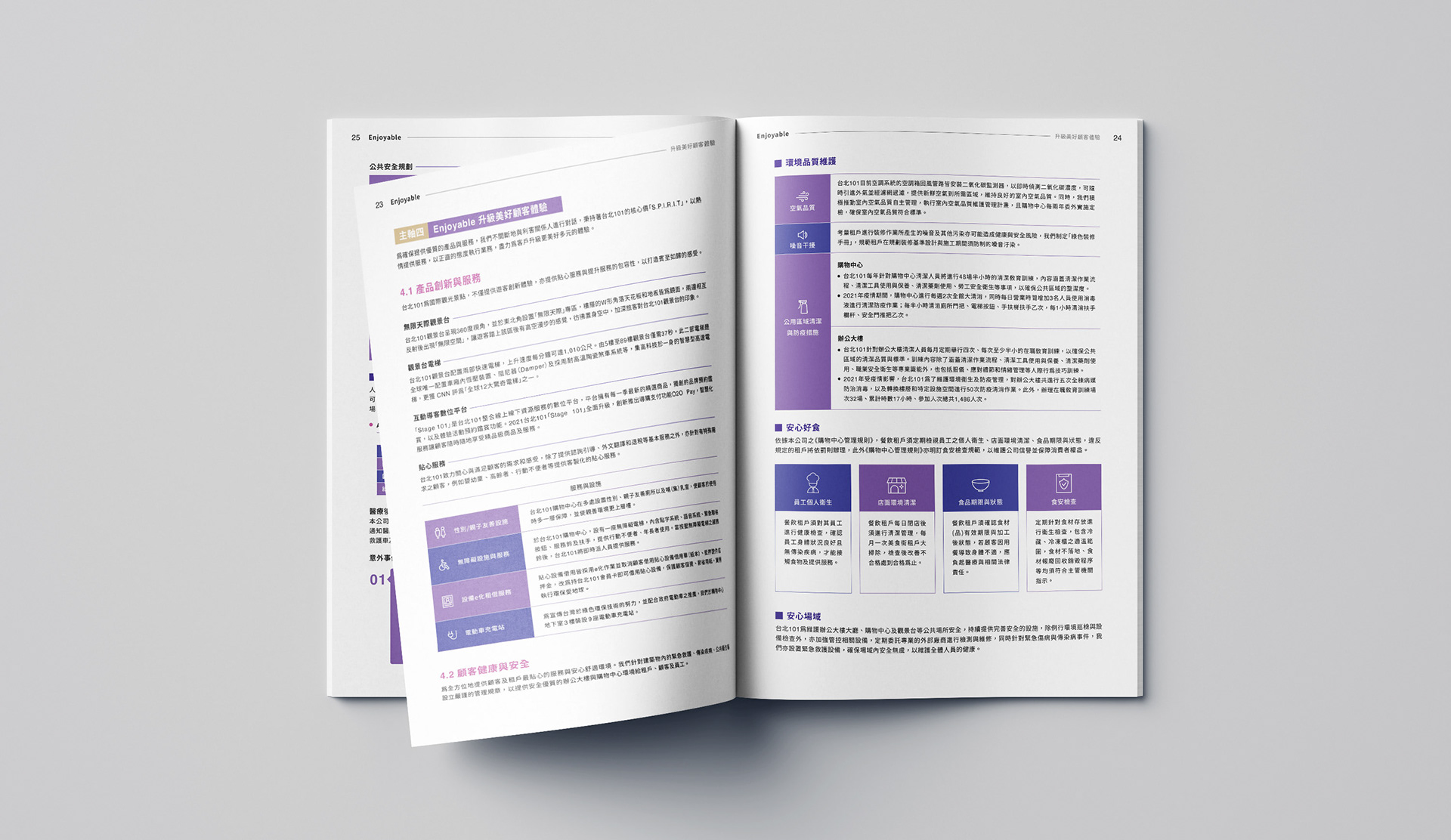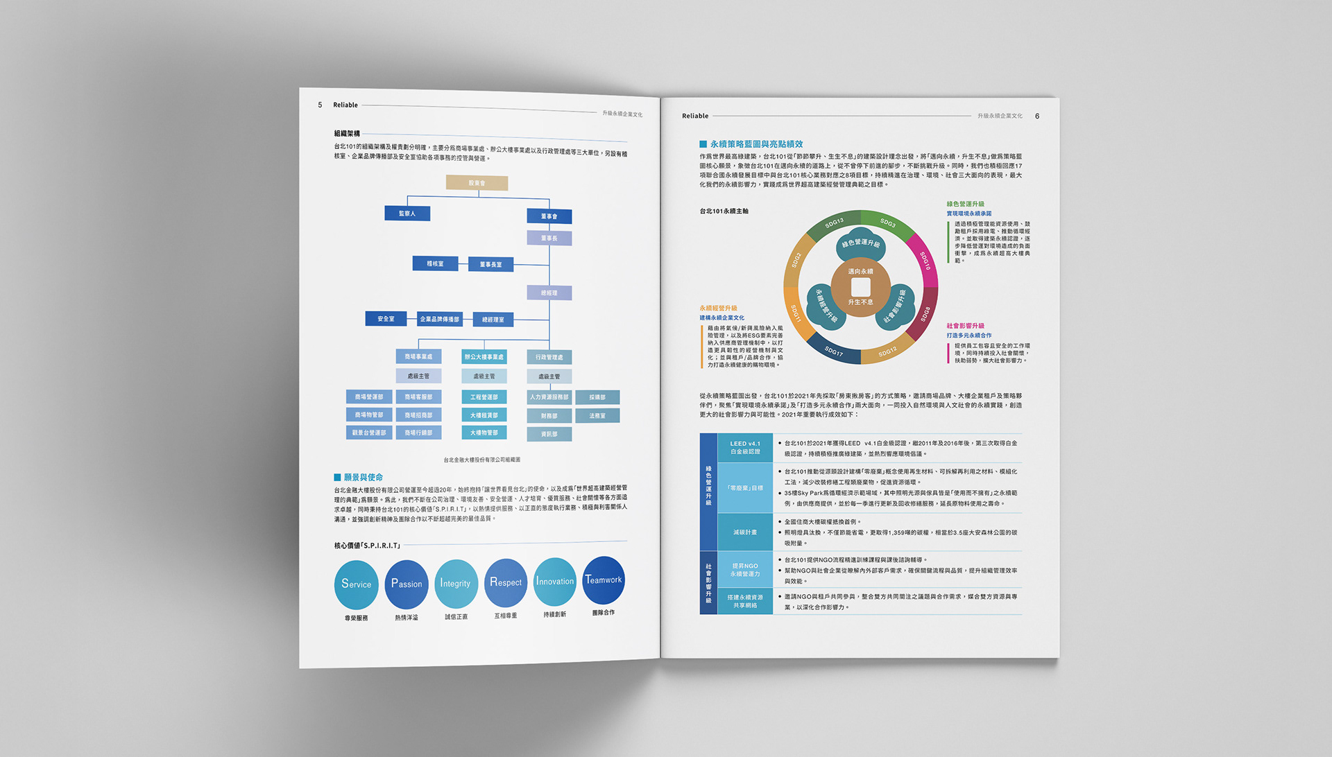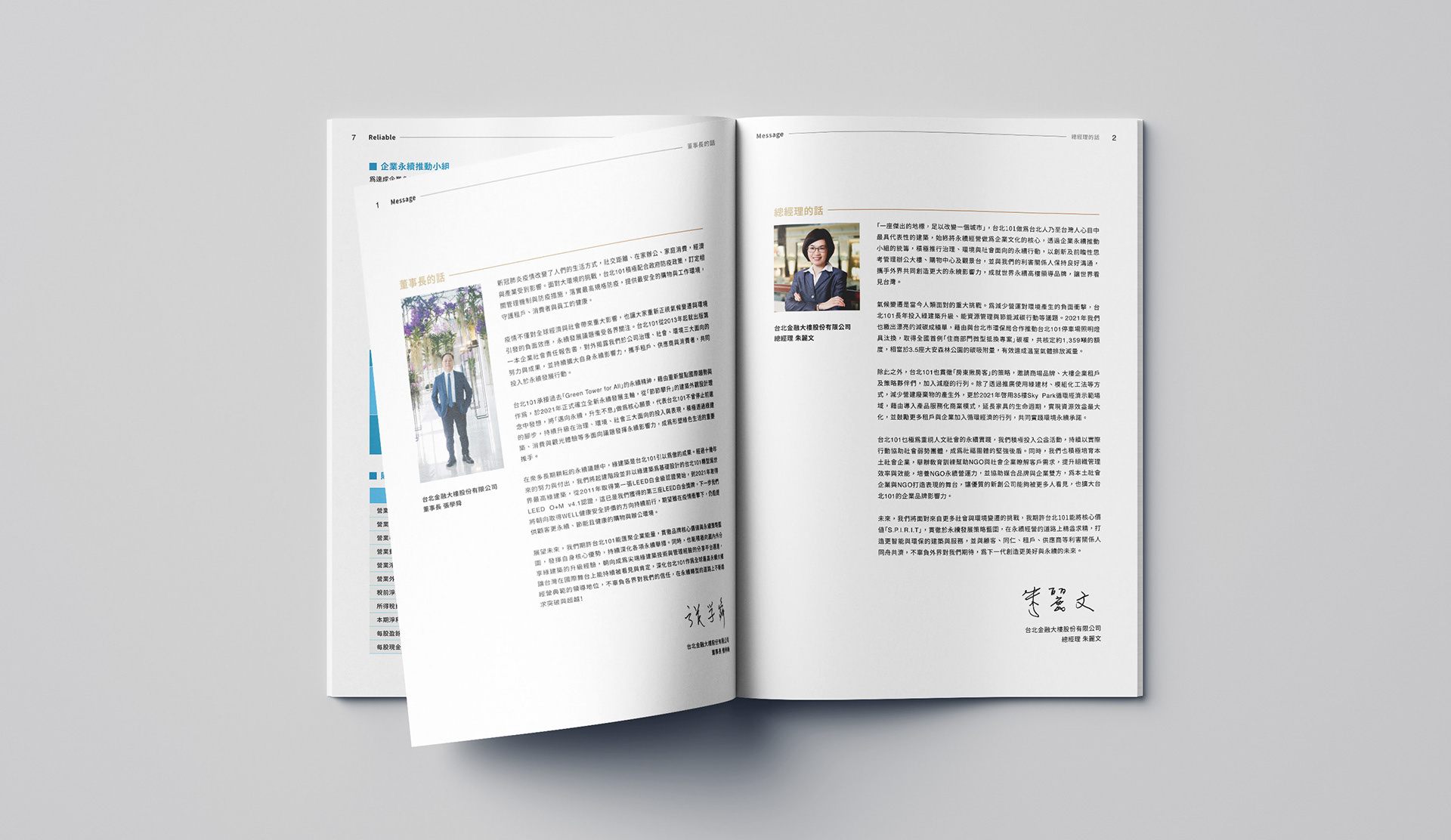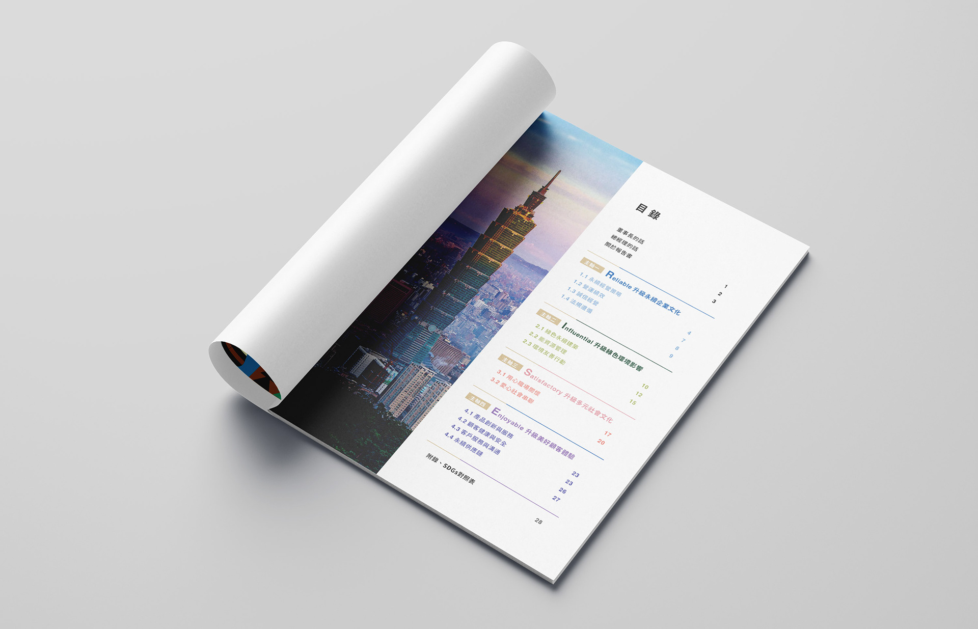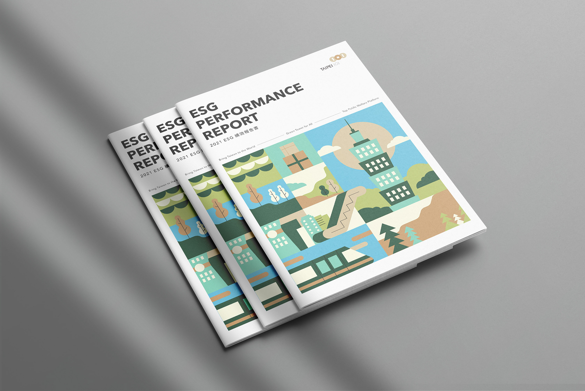 The cover design is inspired by the multifaceted roles of Taipei 101. Using geometric color blocks to depict its different dimensions, the visual language conveys a sense of clarity, vitality, and approachability—bridging the distance between a monumental skyscraper and everyday life. The color palette combines the brand’s signature gold with varying shades of green, expressing both refined quality and a strong connection to the report’s core theme: ESG and sustainable development.