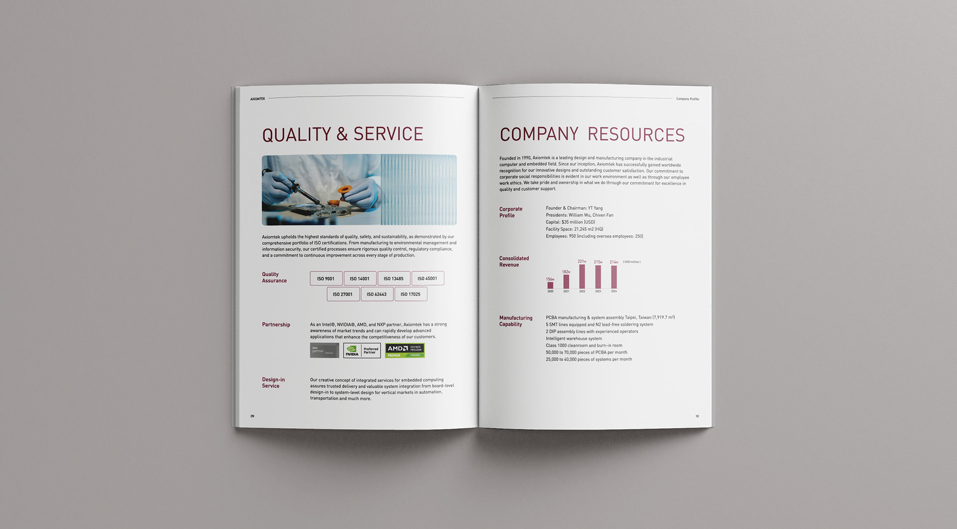 封面設計運用長虹玻璃般的垂直光影層次,象徵技術深耕的厚度與企業內斂理性的質地。結合品牌標準色,營造沈穩高級的視覺語言,畫面中隱約浮現品牌 Logo,象徵其在工業電腦領域的精密佈局與系統整合實力。整體風格高級靜謐,卻又不會太有距離,映現品牌穩健前行、引領未來的優雅姿態。