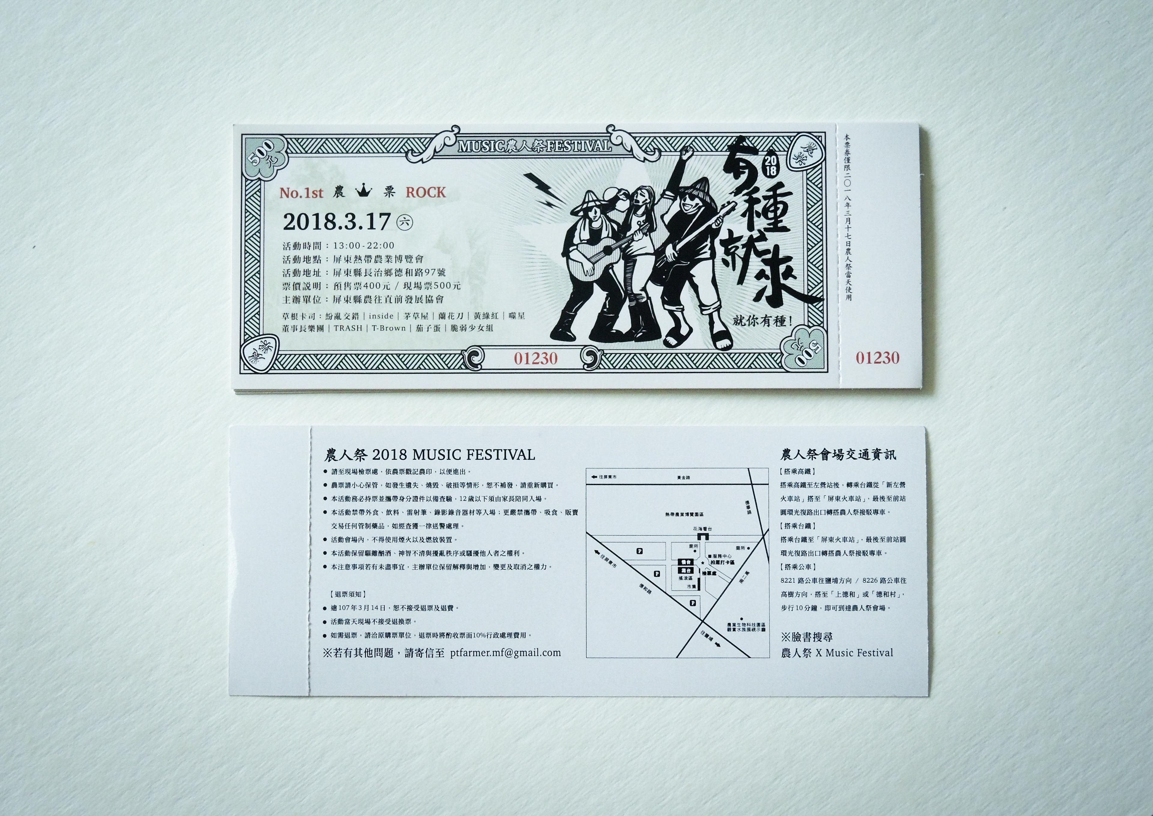 The tickets are designed according to the vouchers/bonds, as the main concept of Farmers’ Rock focus on agricultural activities. The ticket pattern is simplified and comes along with the farmer image and some music elements in order to make the tickets modernistic, which offers a chance for attendees to experience different cultural background.