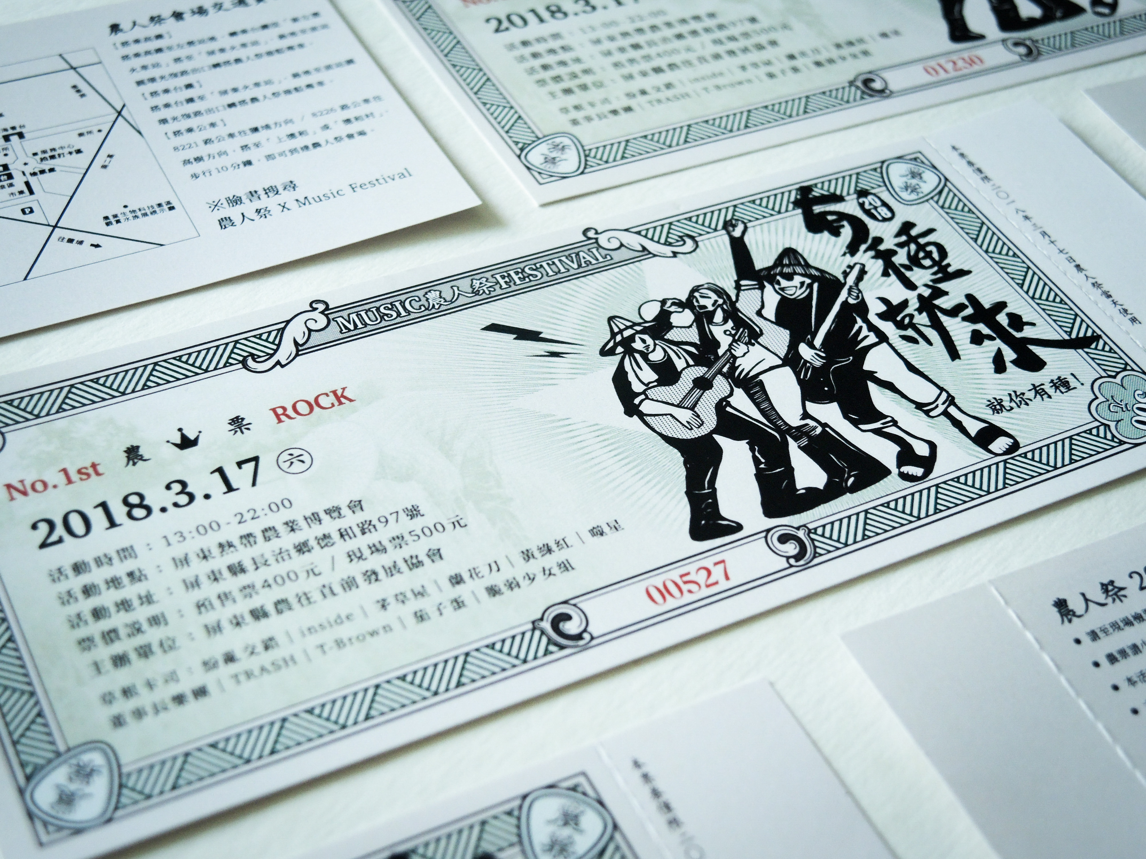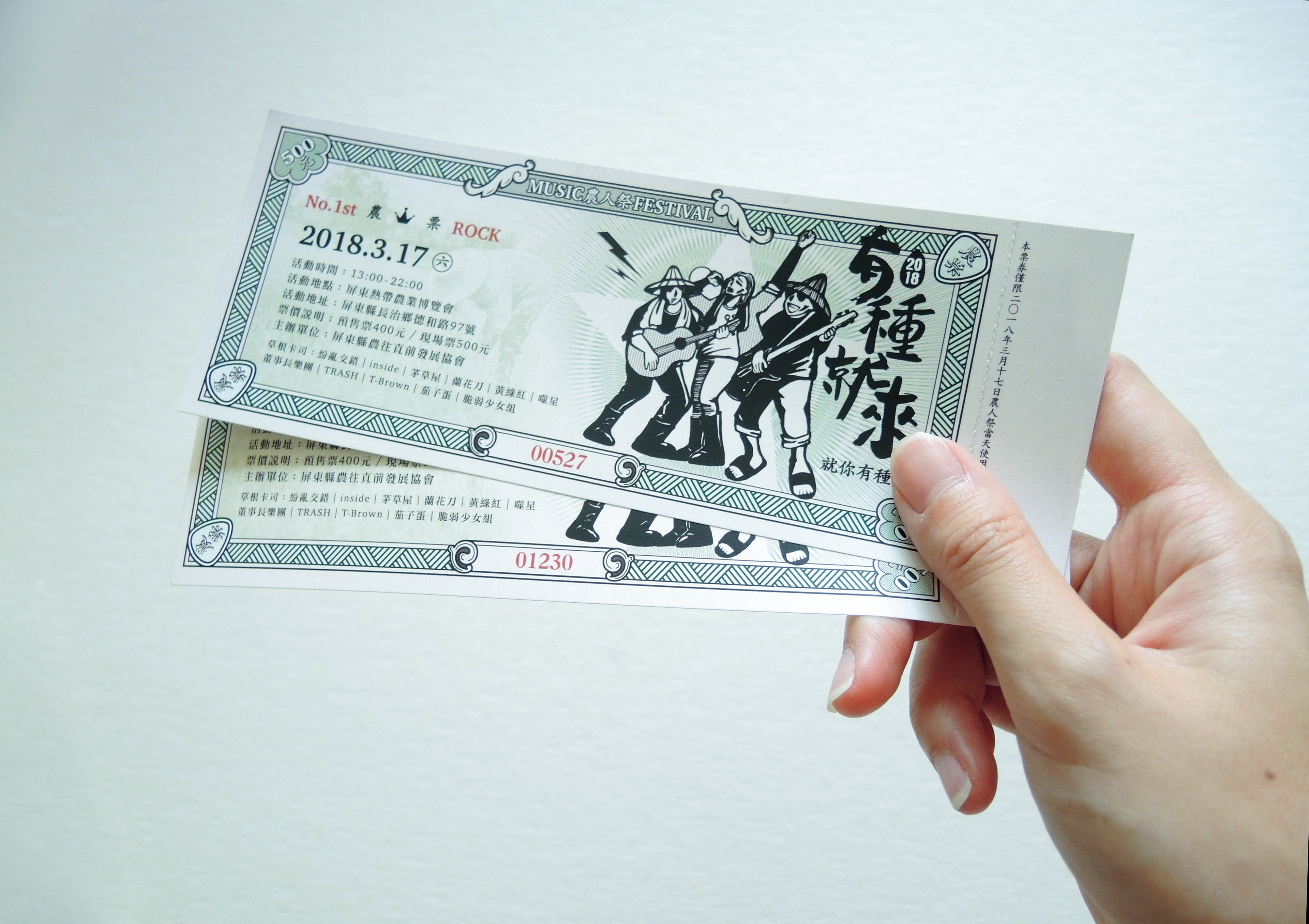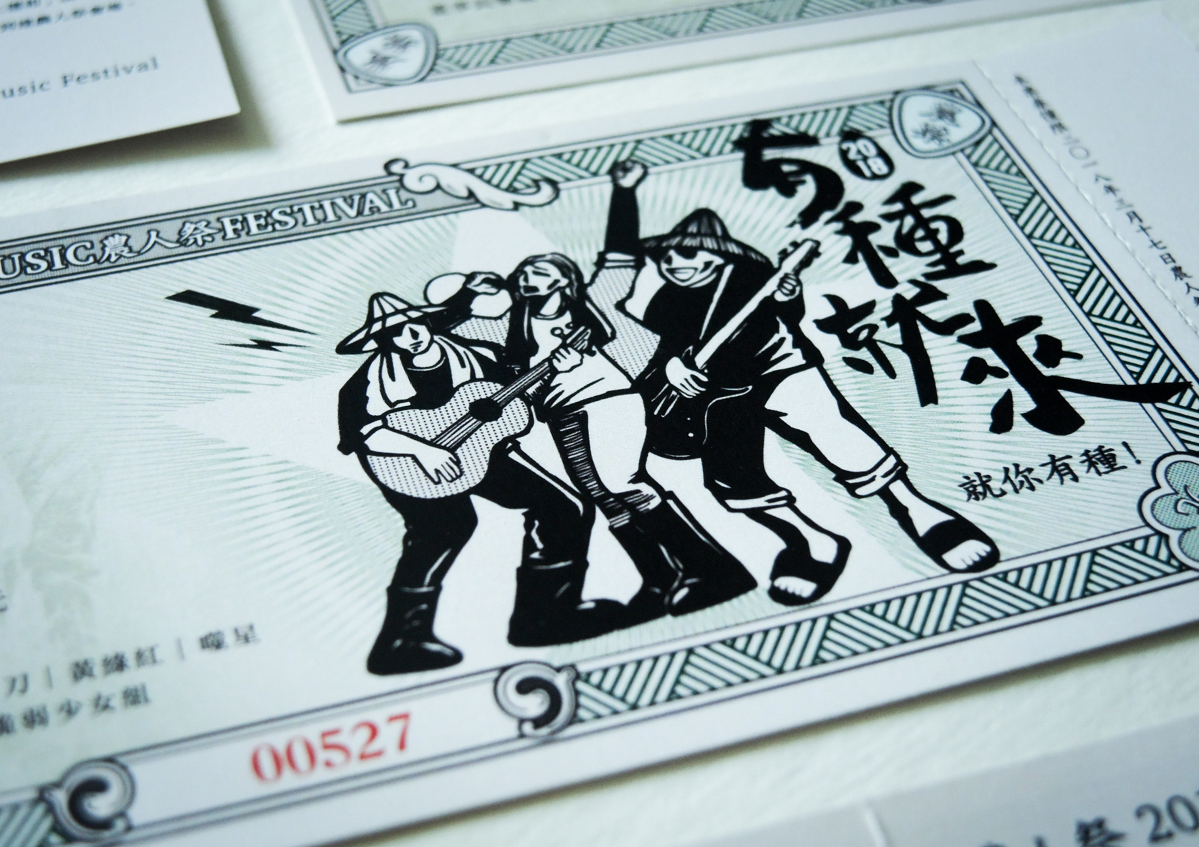 農人祭以農為本、民以食為天,因此票券設計以傳統糧票發想。為了讓票券較有現代感,將繁複的花紋圖樣以線條簡化,並加入農民及音樂元素:吉他pick的邊角花紋、搖滾歡唱的農民插圖、田埂線條的邊框等。希望參加音樂季的民眾看到票券後能夠耳目一新,並能細細品味農業的不同時空背景的文化。