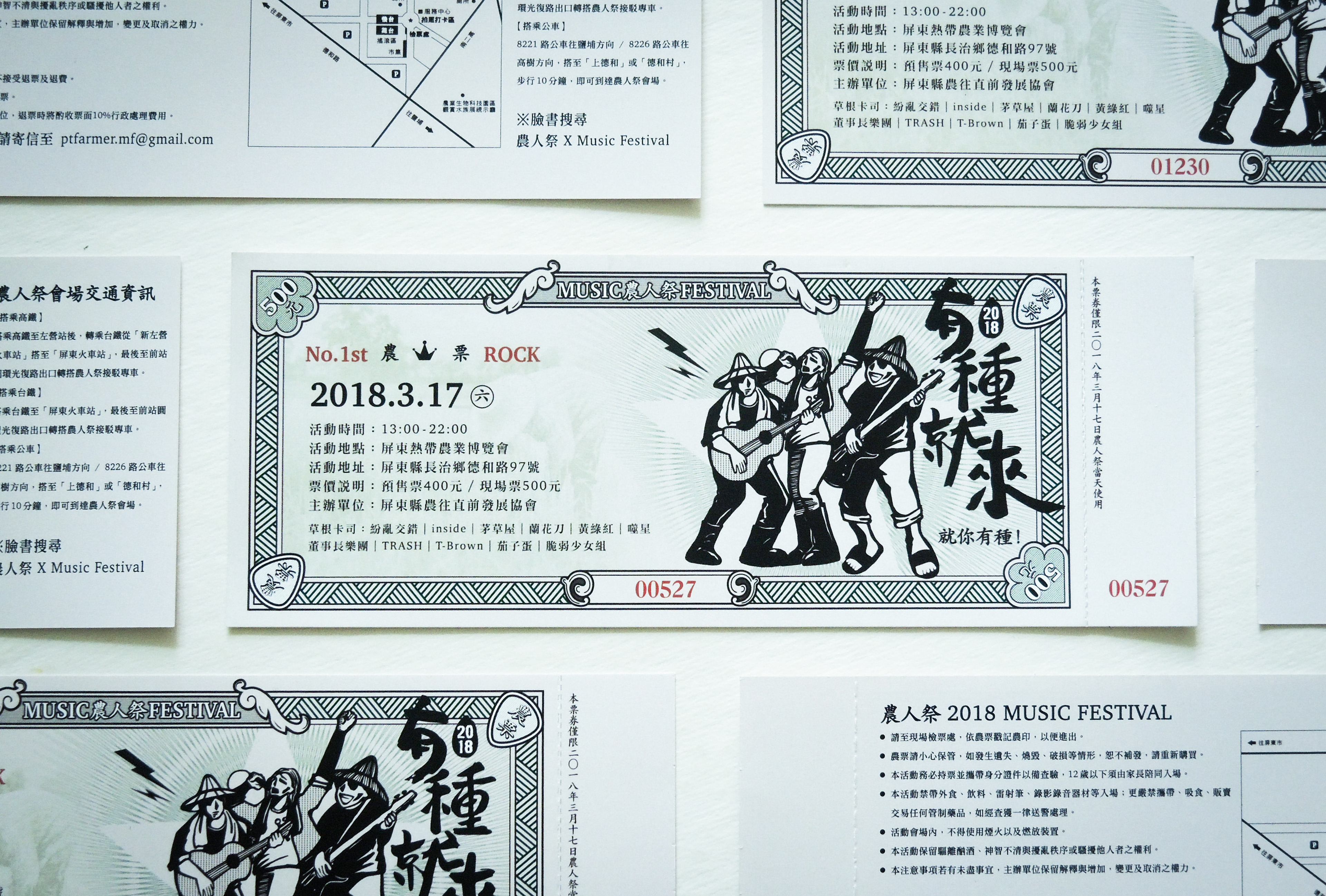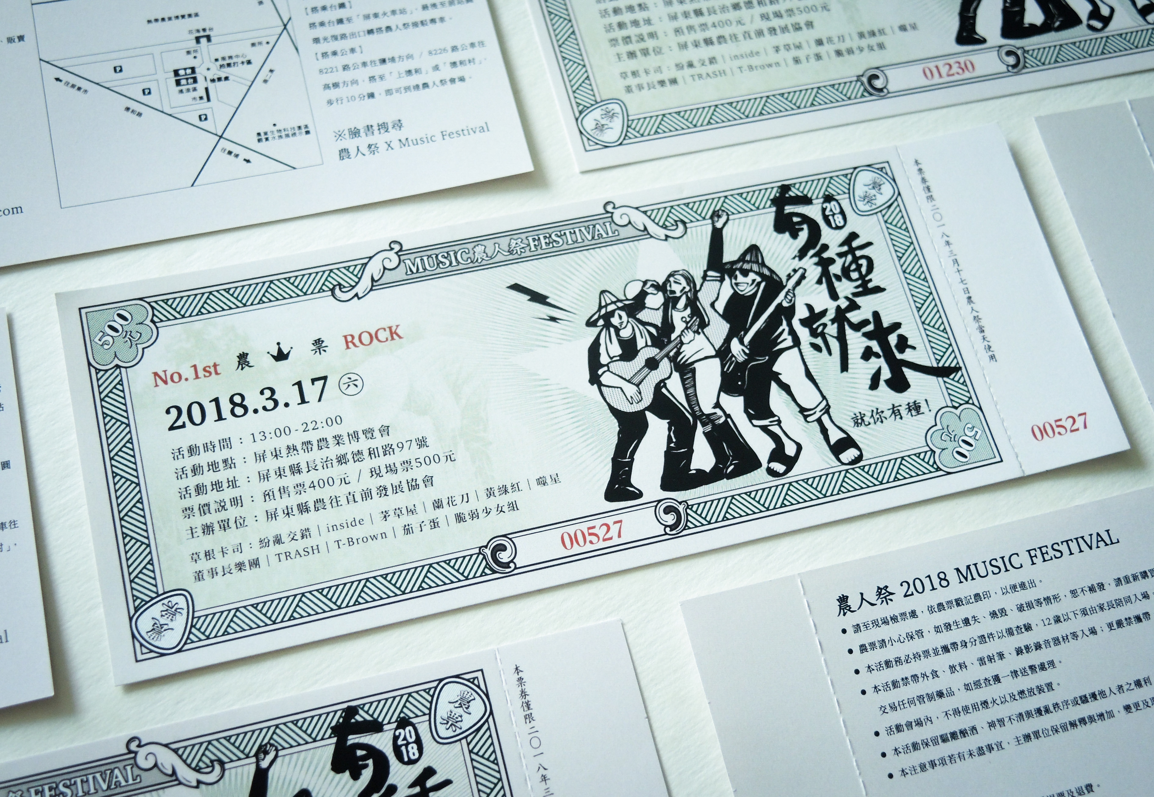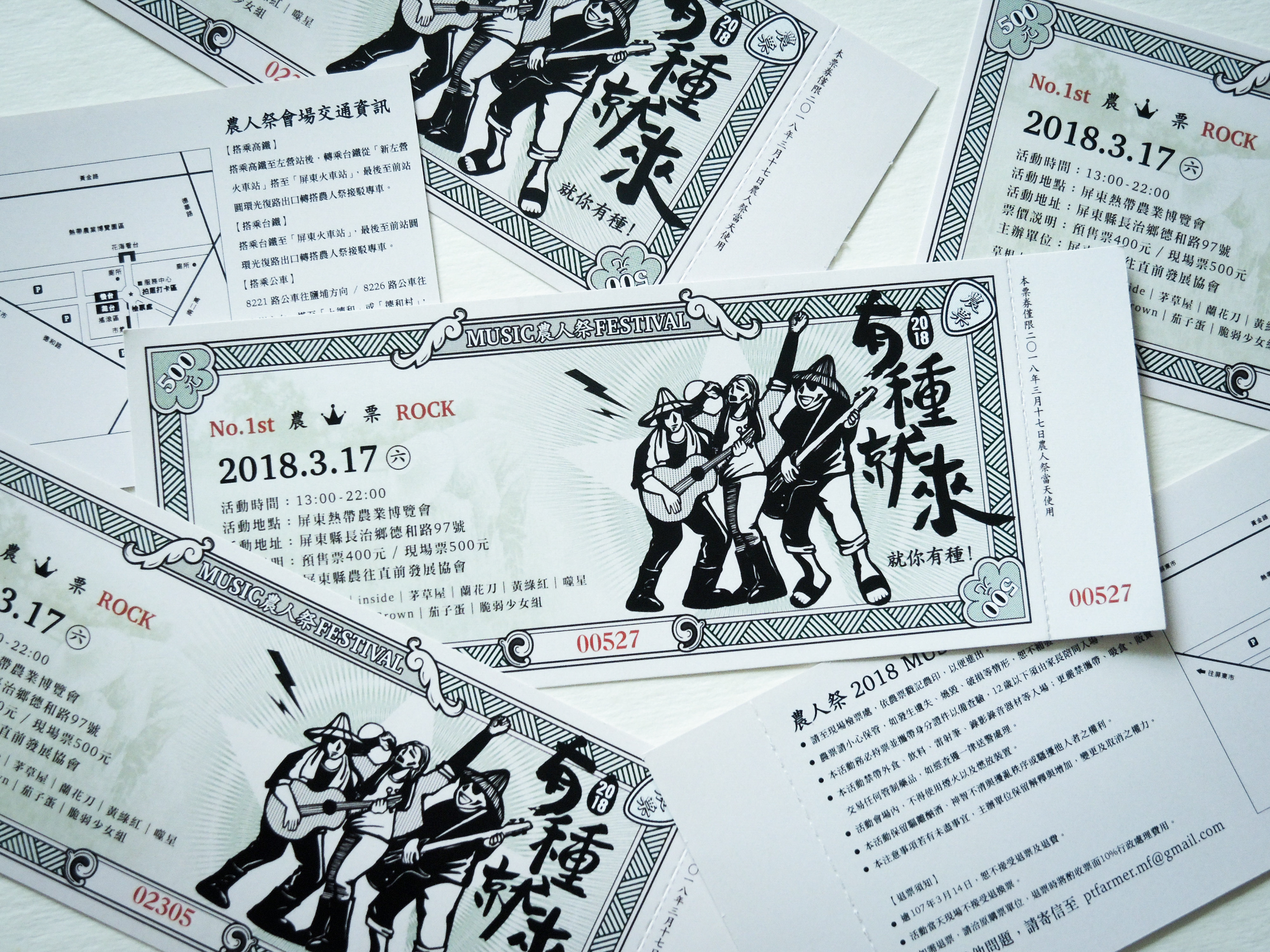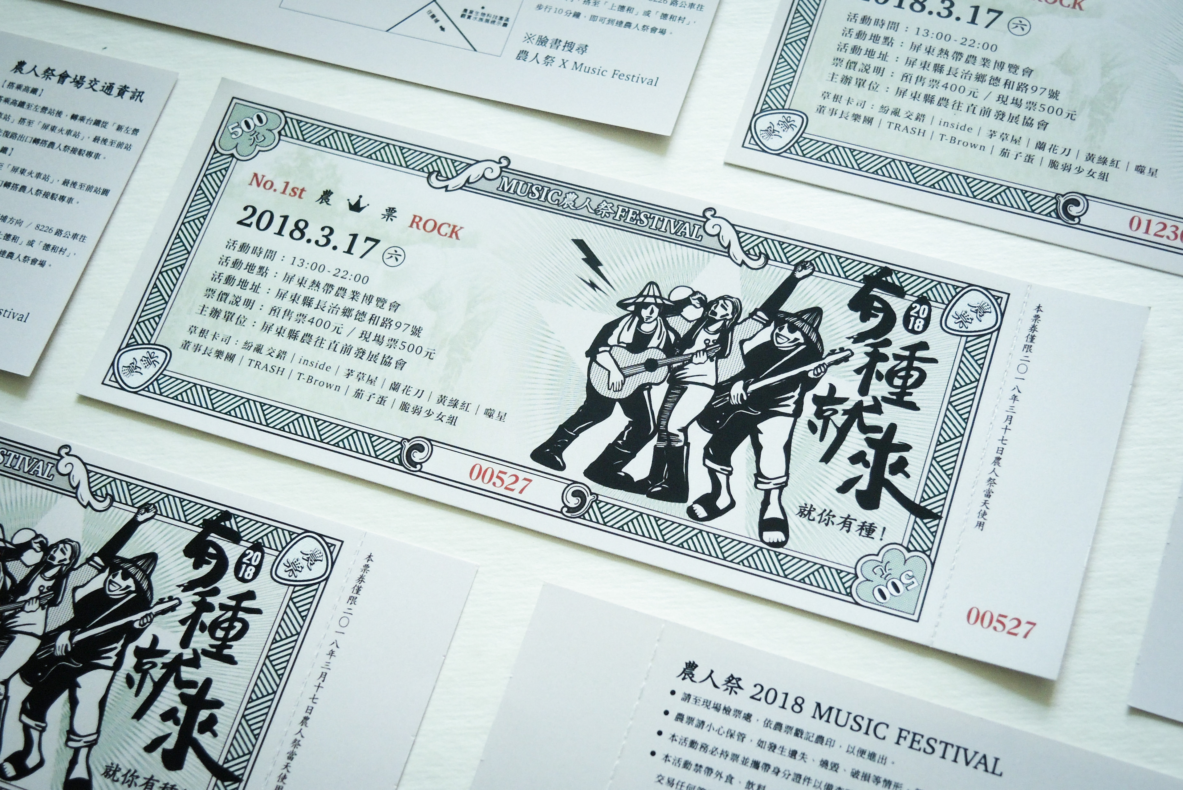 農人祭以農為本、民以食為天,因此票券設計以傳統糧票發想。為了讓票券較有現代感,將繁複的花紋圖樣以線條簡化,並加入農民及音樂元素:吉他pick的邊角花紋、搖滾歡唱的農民插圖、田埂線條的邊框等。希望參加音樂季的民眾看到票券後能夠耳目一新,並能細細品味農業的不同時空背景的文化。
