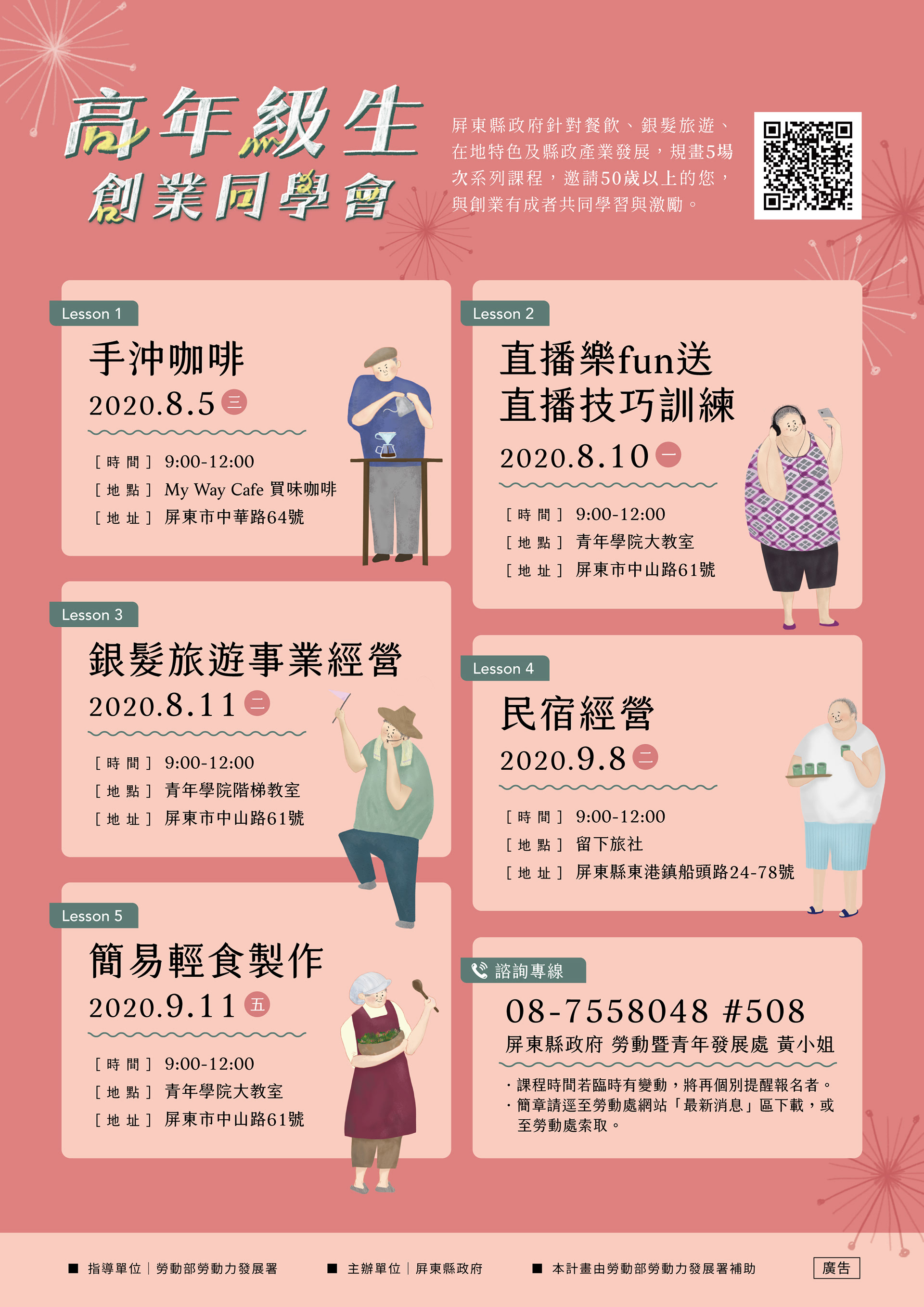 屏東縣整府針對銀髮長者創辦了一系列的課程,並邀請事業有成者一同響應,包含手沖咖啡、民宿經營管理、輕食製作、直播實況、旅遊導覽,希望能讓長者體驗不同的專業技能,開啟第二事業的新可能。